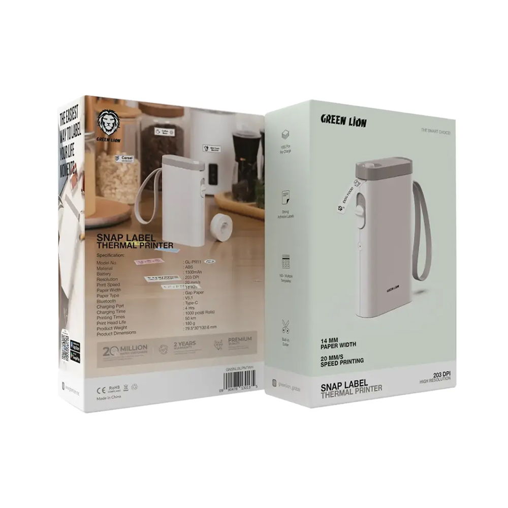 La Green Lion Snap Label 14mm est une imprimante thermique portable conçue pour simplifier l’étiquetage au quotidien. Grâce à sa technologie thermique directe, elle fonctionne sans encre ni toner, ce qui réduit les coûts et l’entretien. Elle imprime des étiquettes de 14 mm de largeur avec une résolution de 203 DPI et une vitesse de 20 mm/s, idéale pour les boutiques, bureaux, écoles ou maisons. Sa batterie de 1300 mAh permet jusqu’à 1000 impressions par charge, et sa connexion Bluetooth 5.1 assure une impression fluide depuis votre smartphone via une application dédiée.