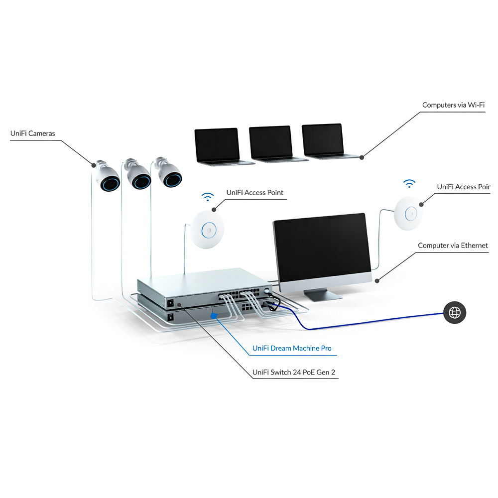 PoE intégré pour alimenter points d’accès, caméras et équipements UniFi